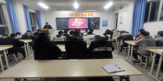 各班团支书首先通过播放视频、PPT的形式进行讲解,并展开讨论。同学们了解到2020年10月19日是中国人民志愿军抗美援朝出国作战70周年纪念日,70年前的今天中国人民志愿军肩负民族的期望,高举保卫和平、反抗侵略的正义旗帜,雄赳赳、气昂昂,跨过鸭绿江,同朝鲜人民一道共同抗击侵略者。通过学习,同学们了解了抗美援朝历史,学习人民志愿军英雄事迹和抗美援朝精神,提高了国防意识,增强了爱国情怀。