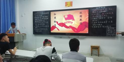 为进一步做好公司“扫黑除恶”专项斗争工作,教育员工树立良好的法律意识,营造一个和谐、安全的校园环境,5月20日晚自习期间,结合公司工作实际开展了以“扫黑除恶”教育为主题的班会活动,全体18级员工参加。
