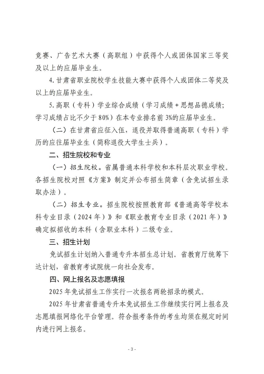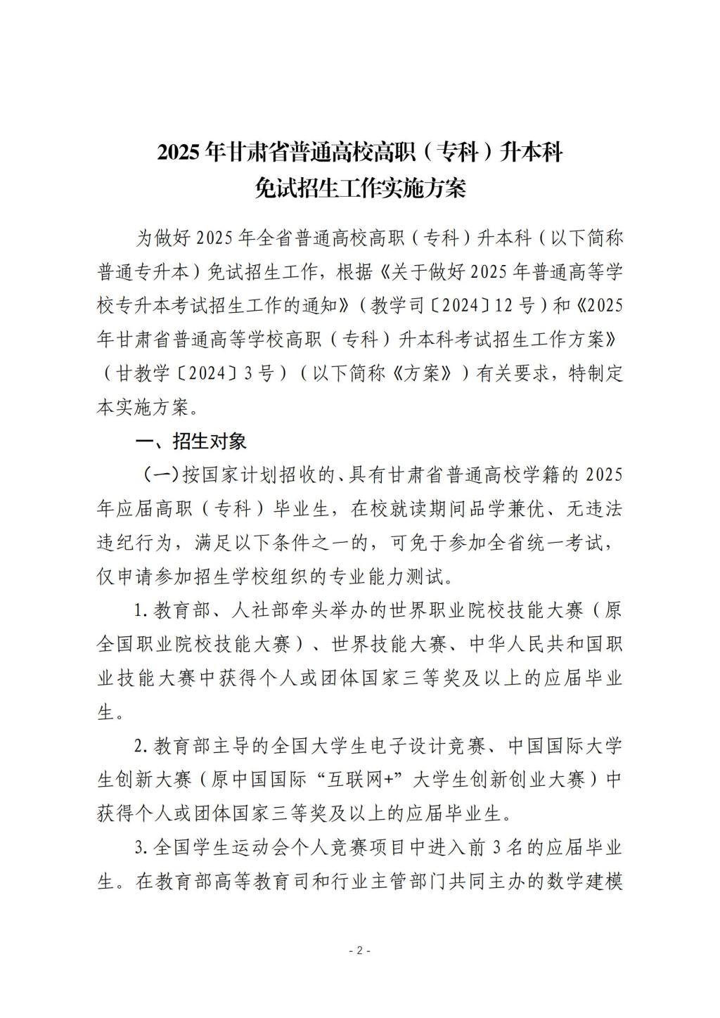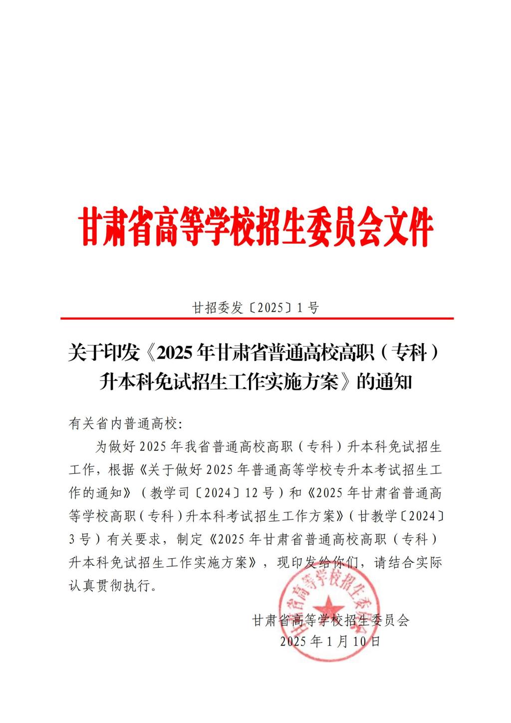 关于印发《2025年甘肃省普通高校高职(专科)升本科免试招生工作实施方案》的通知